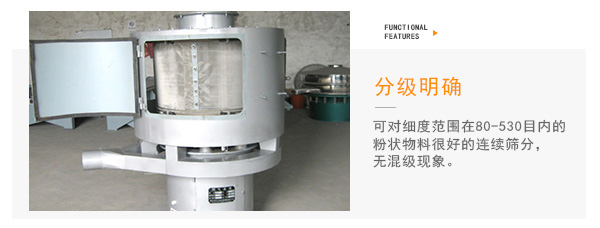 1. 可對細(xì)度范圍在80-530目內(nèi)的粉狀物料很好的連續(xù)篩分,無混級現(xiàn)象。
