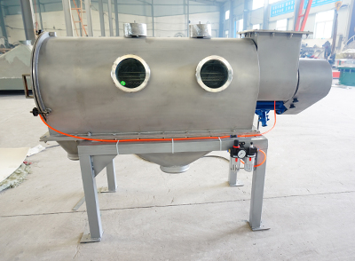臥式氣流篩又叫氣旋篩:當(dāng)物料經(jīng)由臥式氣流篩進(jìn)料口物料通過(guò)螺旋輸送系統(tǒng)后與氣流混合、霧化進(jìn)入網(wǎng)筒內(nèi),網(wǎng)筒內(nèi)風(fēng)輪葉片連續(xù)轉(zhuǎn)動(dòng),使物料同時(shí)受到離心力和旋風(fēng)推進(jìn)力,產(chǎn)生運(yùn)動(dòng)沖向篩網(wǎng),過(guò)網(wǎng)的物料從細(xì)料排出口排出,不能過(guò)網(wǎng)的物料繼續(xù)向前從粗料排出口排出,達(dá)到快速分離目的。